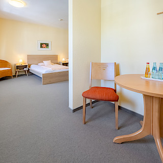 Die Familienzimmer sind 36 - 40 m² groß und beinhalten ein Doppelbett und ein Einzelbett im separaten Zimmer (mit Schiebetür getrennt).