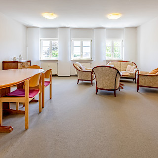 Our living room is located on the 2nd floor. It is 35 m² in size and equipped with a large table for up to 8 people and a comfortable couch with armchair for 5 people.